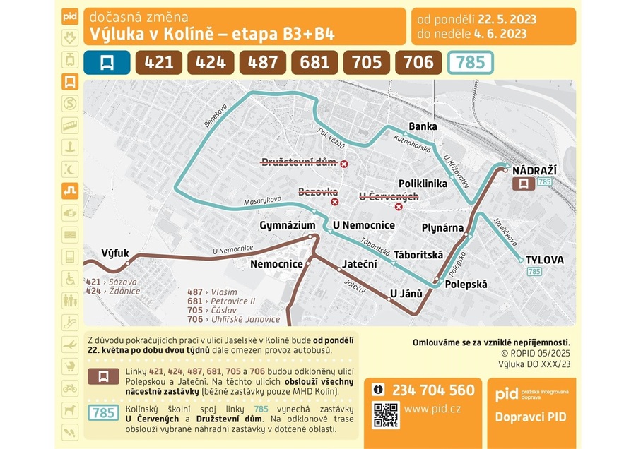 z důvodu rekonstrukce komunikace I/38H v Kolíně dochází u linek 421, 424, 487, 681, 705, 706 a 785 k zavedení výlukového opatření v termínu od 22.5.2023 do 4.6.2023.