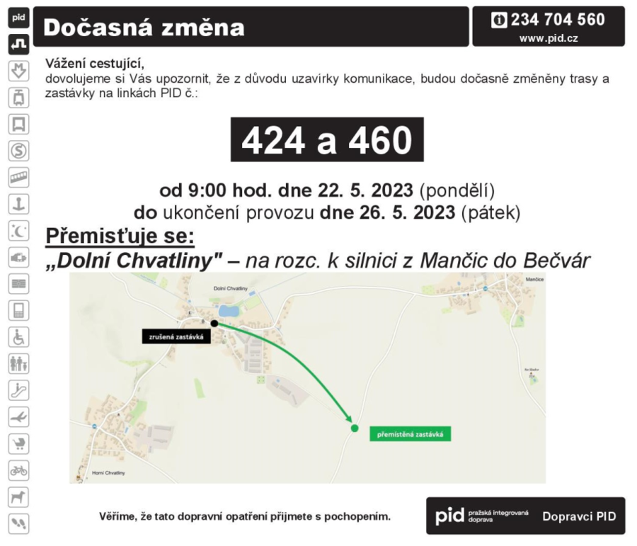 z důvodu pokládky asfaltových vrstev na silnici č. III/33337 přes obec Dolní Chvatliny dochází na linkách PID 424 a 460 ke změně tras a zastávek v termínu od 9:00 hod. dne 22. 5 2023 (pondělí) do cca 26. 5. 2023 (pátek). Časové polohy spojů zůstávají neměnné.