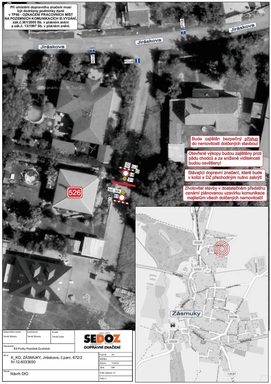 upozorňujeme, že v období od 7. 1. - 10. 1. 2024 dojde k přechodné úpravě provozu v ulici Jiráskova (viz. schéma DIO). V těchto úsecích prosím dbejte zvýšené opatrnosti a pohybujte se v místech k tomu určených.