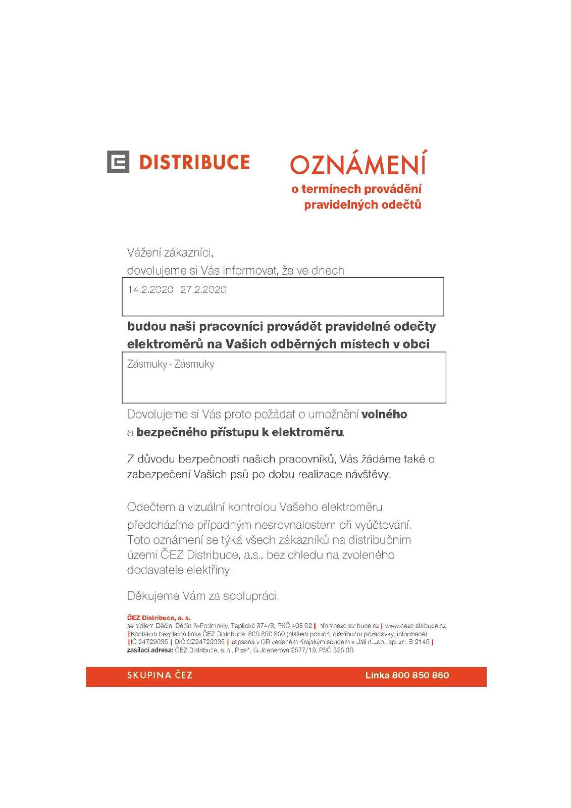 oznamuje, že ve dnech 14.2.2020 - 27.2.2020 bude proveden odečet elektroměrů.