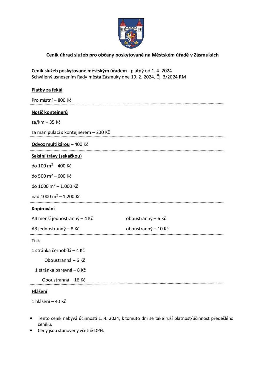rádi bychom Vás informovali, že od 1. dubna 2024 dojde ke zvýšení ceníku služeb pro občany poskytované na městském úřadě.