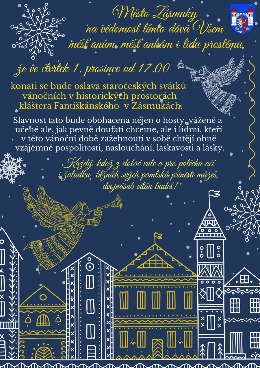 dovolujeme si Vás pozvat na oslavu staročeských vánočních svátků, která proběhne 1. prosince od 17.00 v prostorách kláštera Františkánského v Zásmukách. Můžete se těšit na povídání o staročeských vánočních zvycích a obyčejích, dále na prohlídku kláštera a povídání o historii kláštera. Občerstvení bude zajištěno.