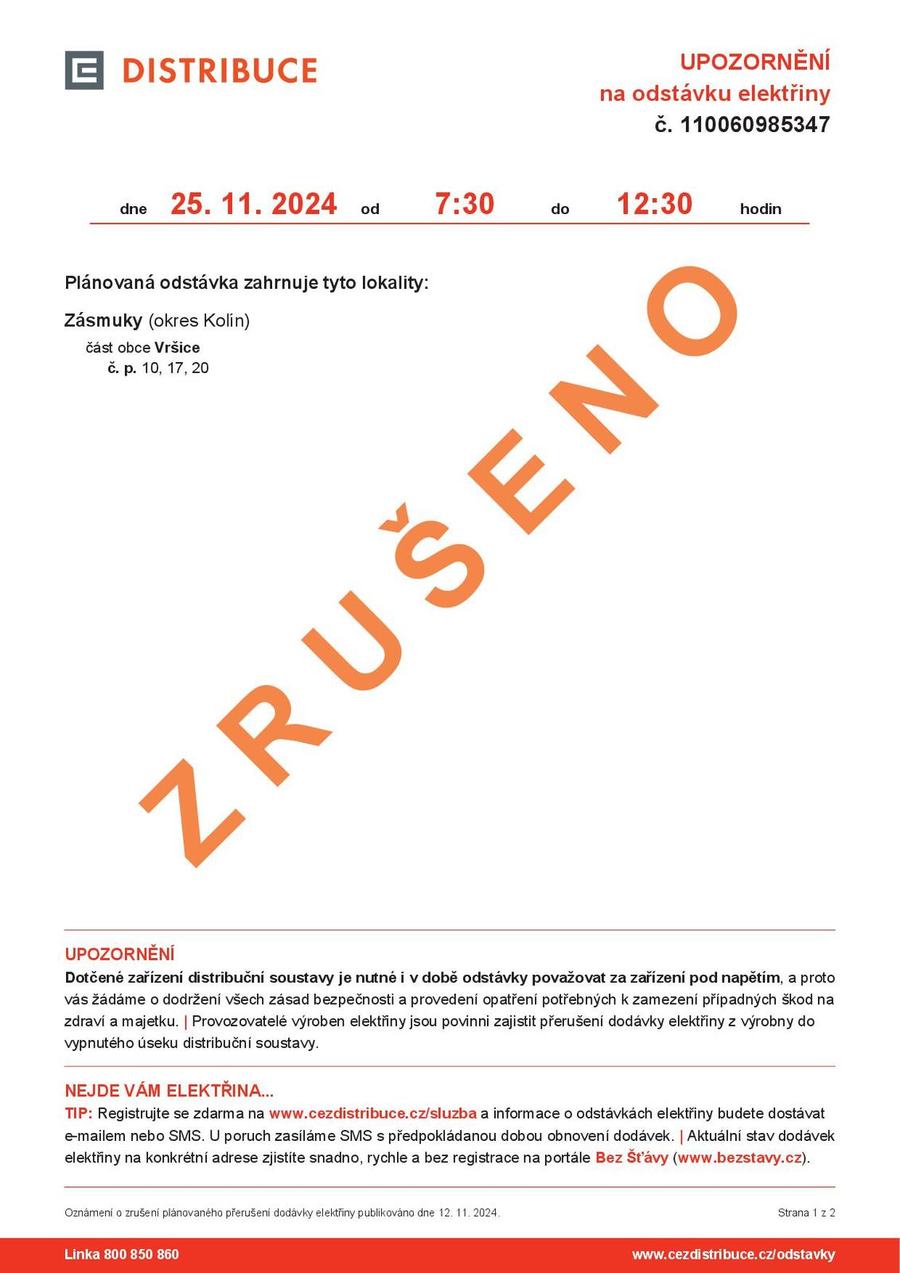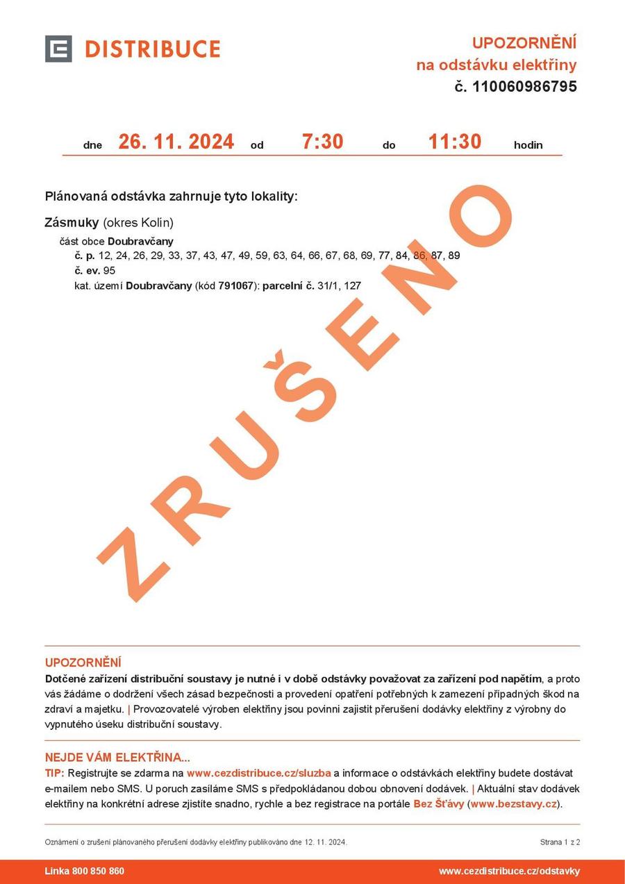 v úterý 26. 11. 2024 dojde k přerušení dodávky pitné vody v Nerudově ulici v Zásmukách. Oprava bude probíhat od 8.00 - 13.00 hodin.