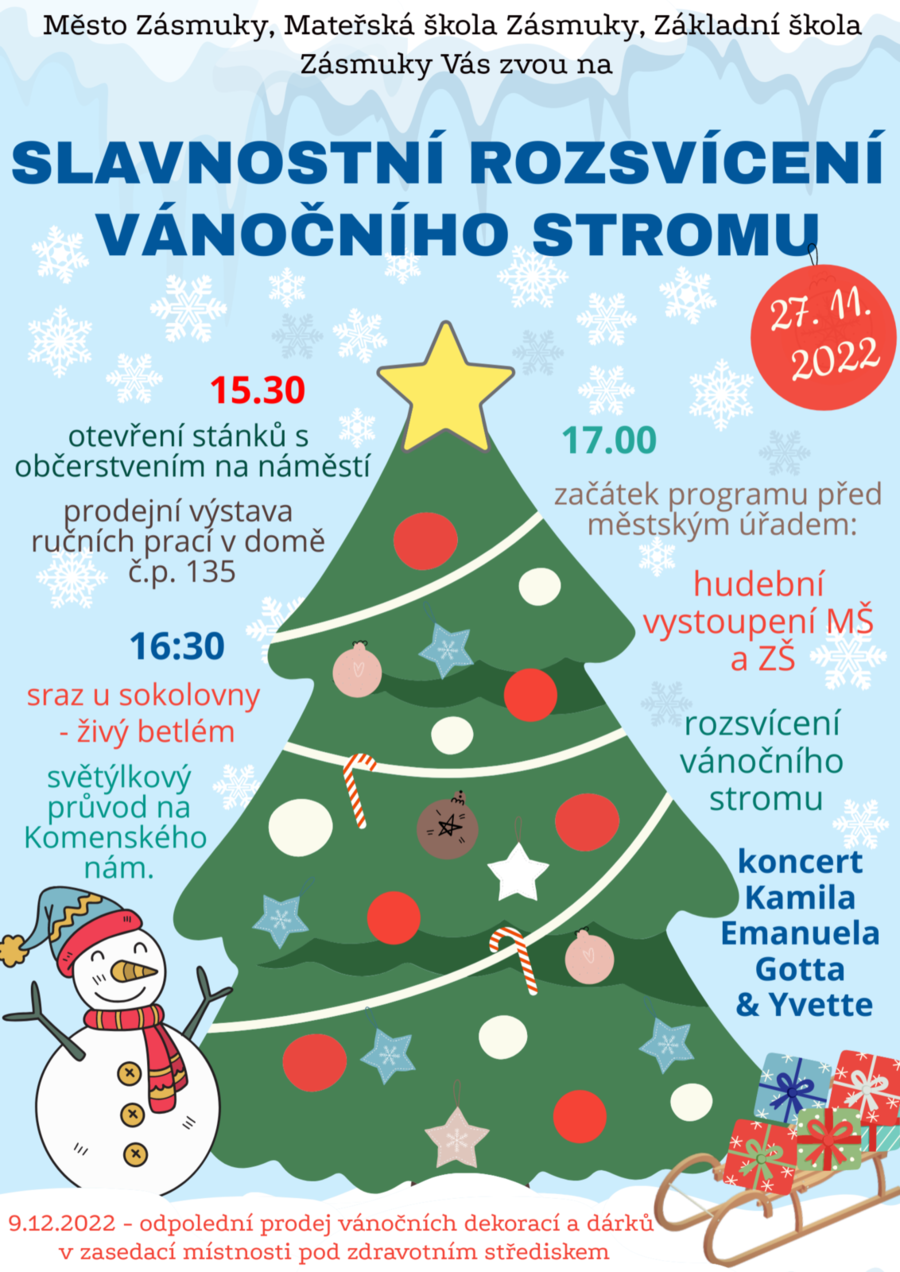 Město Zásmuky Vás zve na slavnostní rozsvícení vánočního stromu, které se uskuteční první adventní neděli 27.11.2022 na Komenského nám. V této souvislosti nabízí možnost stánkového prodeje. V případě zájmu o stánek kontaktujte paní starostku PhDr. Martu Vaňkovou, tel: 722 935 001, e-mail: starosta@zasmuky.cz.