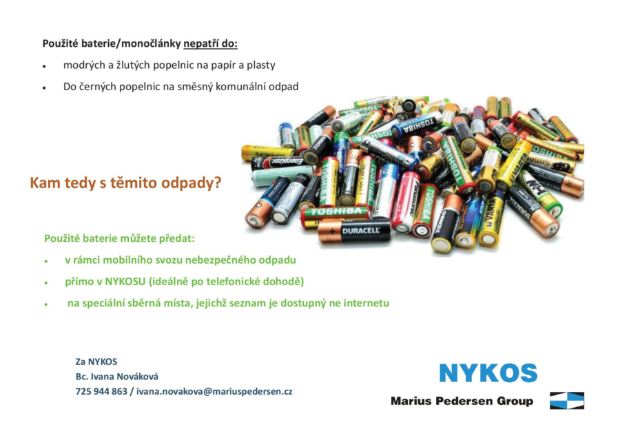 Z toho důvodu připomínáme, že baterie nepatří ani do barevných nádob, ani do směsného komunálního odpadu. Tento odpad je možné předat společnosti NYKOS, nebo na jiných místech, které jsou zapojené do systému Ecobat, seznam těchto míst naleznete na tomto odkaze: Ecobat