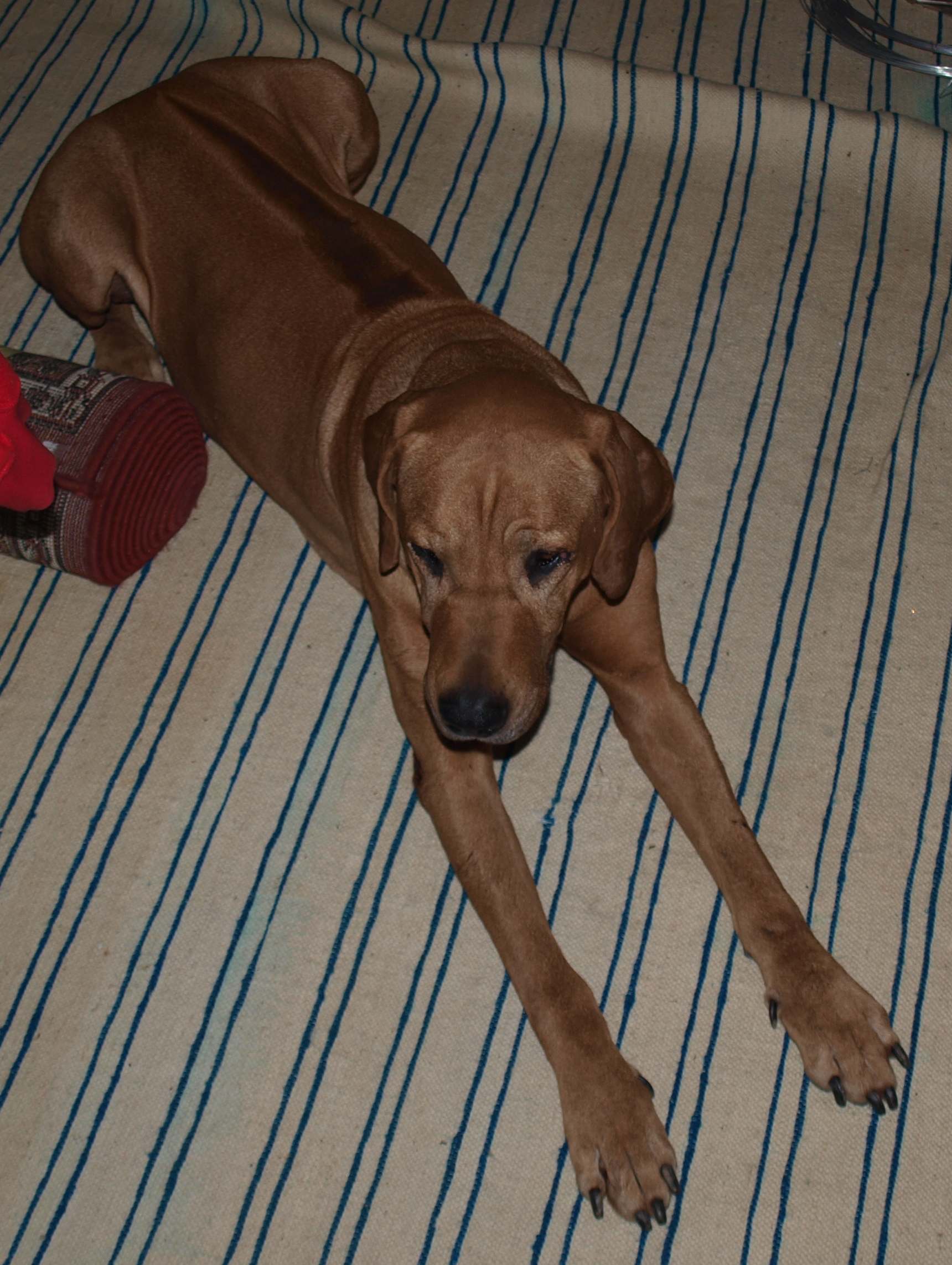 údolí" u Kapličky. Pes vypadá jako starší Ridgeback, má na krku obojek