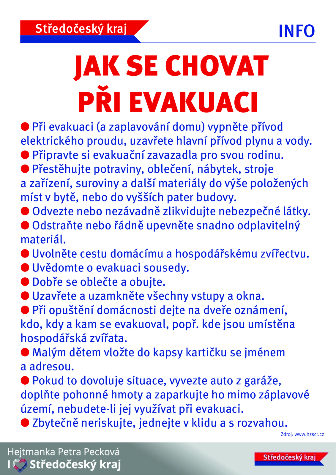 v příloze najdete krizové letáky s jednoduchými pokyny, jak se chovat během povodní a jak se na tuto situaci předem připravit. Doporučujeme zachovat klid a řídit se uvedenými instrukcemi. Sledujte průběžné informace od ČHMÚ, v médiích a na sociálních sítích předpovědi se mohou měnit.