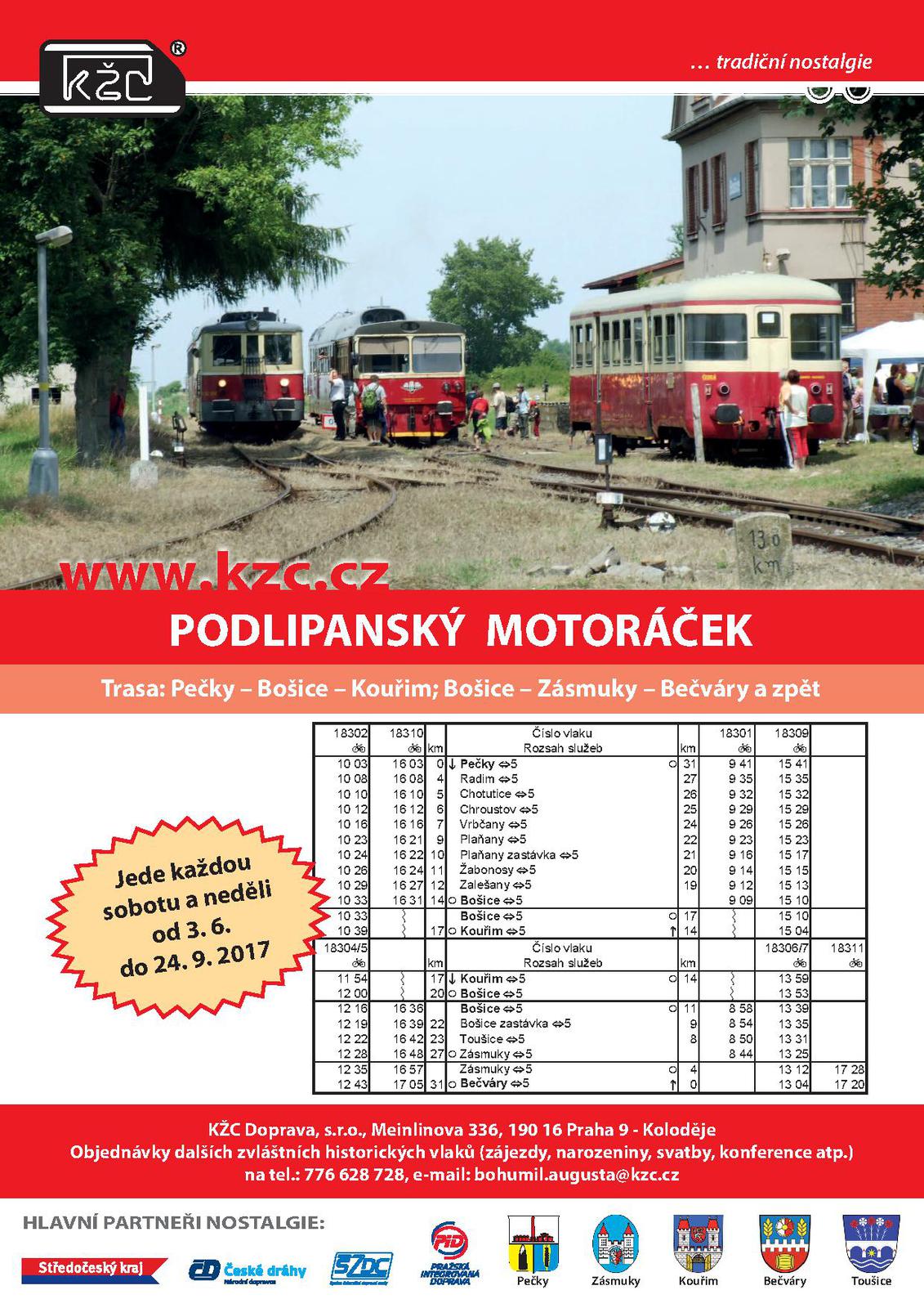 Podlipanský motoráček od 3.6. 2017 je opět v provozu. Jízdu motoráčkem můžete využít pro rodinné výlety až do 24.9. 2017. Nastoupíte na nádraží v Zásmukách a motoráček Vás doveze přes Bošice, Kouřim až do Peček. Stejnou trasou se dostanete i zpět do Zásmuk.