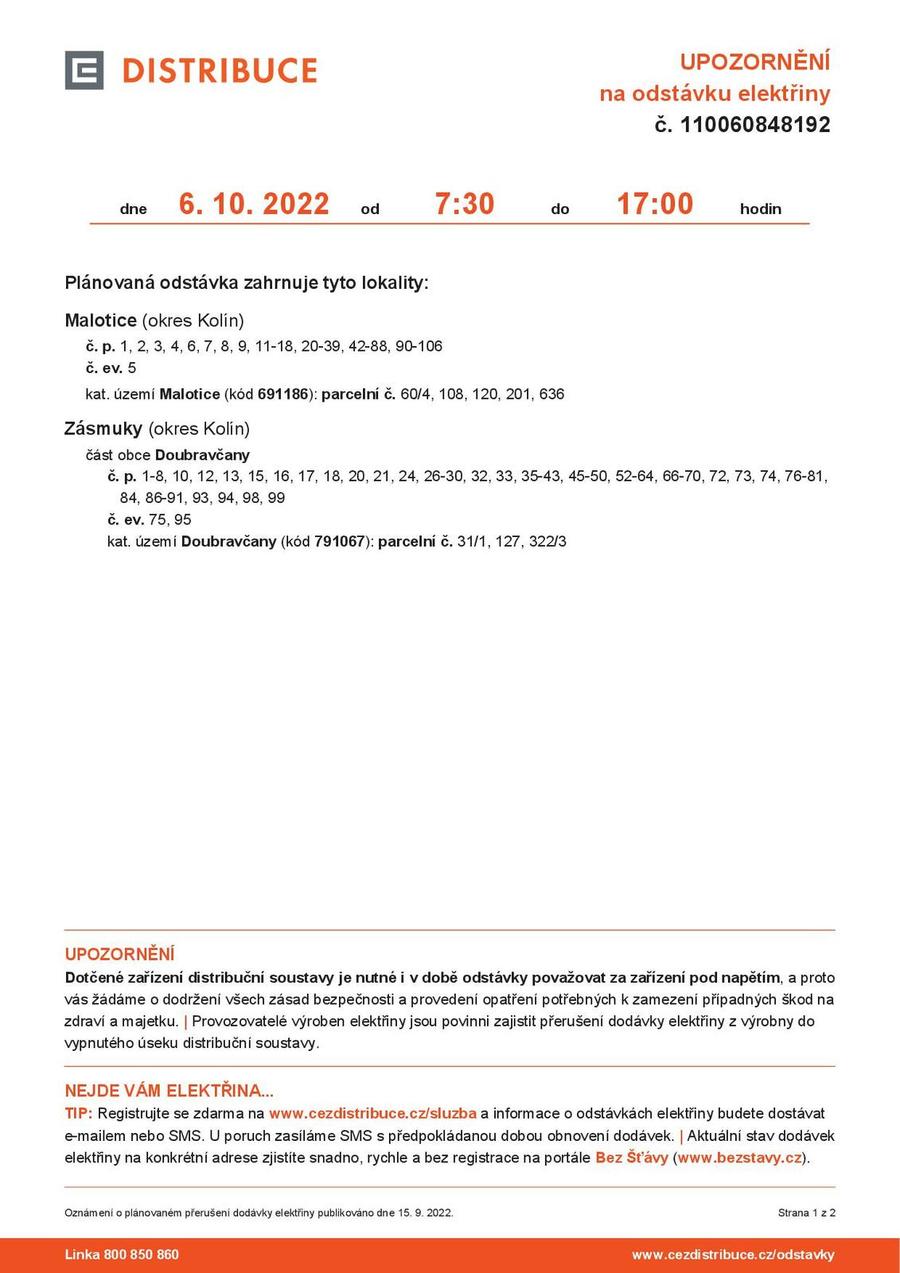 Plánovaná odstávka el. energie dne 6.10.2022 - Doubravčany