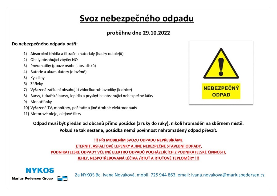 dovolujeme si Vám oznámit, že svoz nebezpečného odpadu proběhne v sobotu  29.10.2022.          Svoz nebezpečného odpadu + co předávat v rámci svozu.jpg