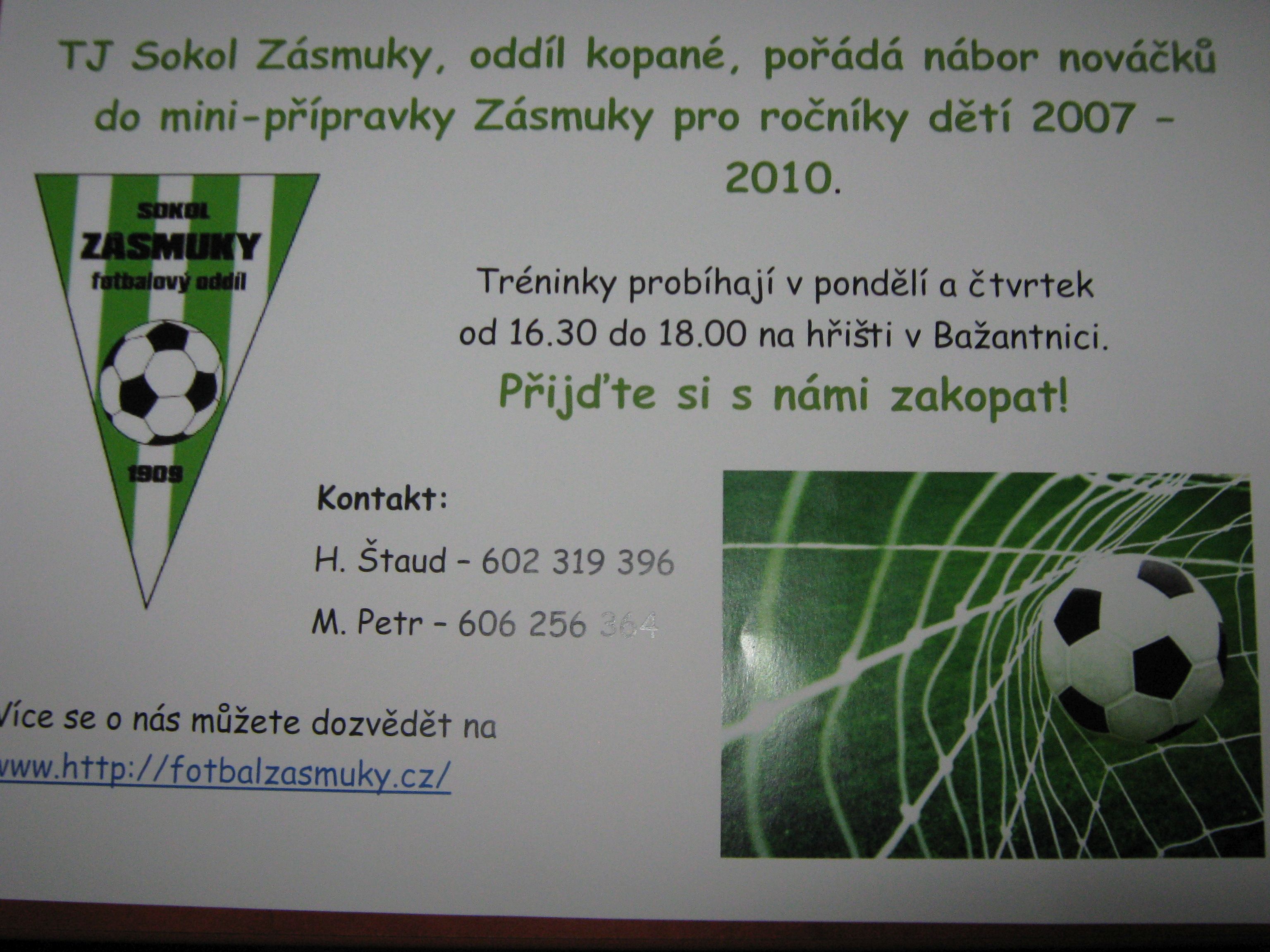 TJ SOKOL Zásmuky, oddíl kopané,  pořádá nábor nováčků do mini-přípravky Zásmuky