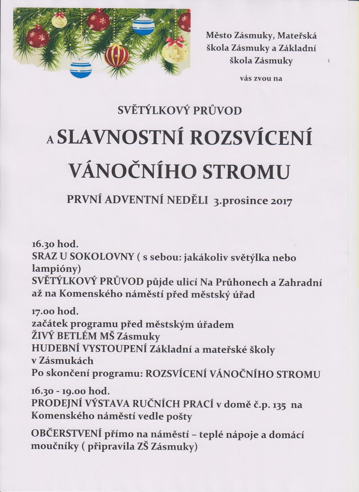 Děti z mateřské školy pro Vás připravily živý betlém a děti ze základní školy a mateřské školy pro Vás připravily hudební vystoupení. Připraveno je občerstvení pro děti i dospělé (připravila ZŠ Zásmuky) Prodejní výstava ručních prací se bude konat v domě čp.135 na Komenského náměstí vedle pošty, zakoupením výrobků si můžete doplnit vánoční výzdobu svých domovů.
