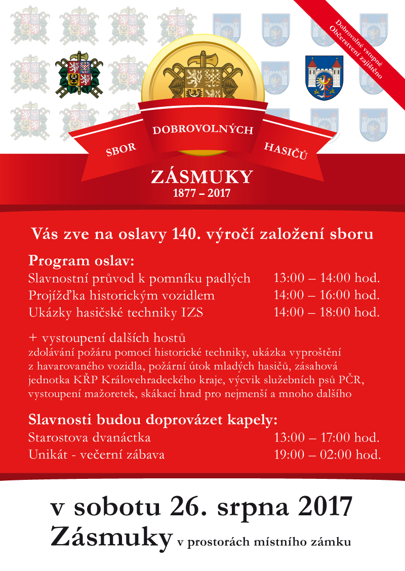Sbor dobrovolných hasičů Zásmuky Vás zve na oslavy 140. výročí založení sboru