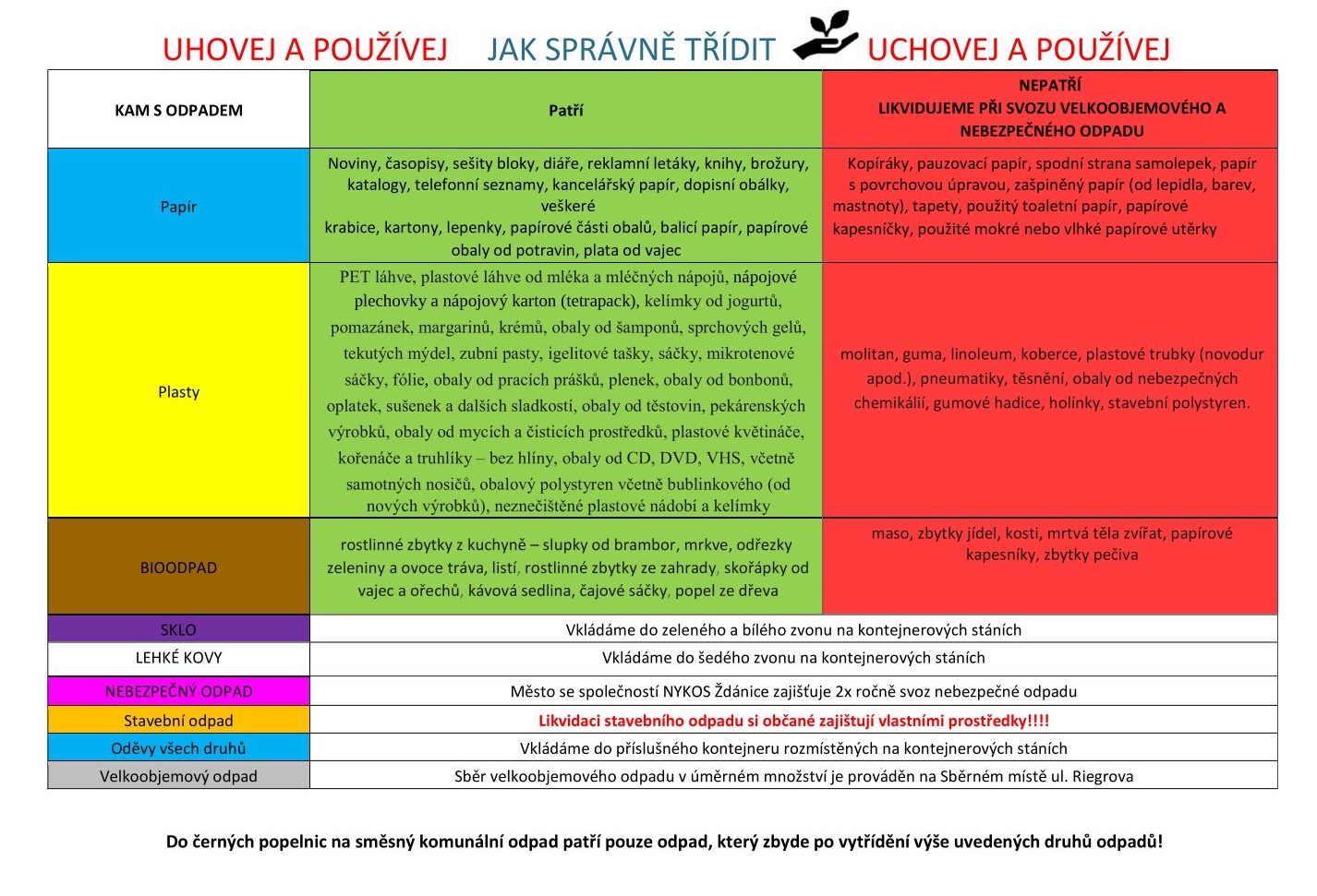 V ulicích našeho města a v přilehlých obcích jsou rozmístěny kontejnery na tříděný odpad, které jsou barevně odlišeny. Odpady by měly být tříděny již v domácnostech. Svoz veškerého odpadu provádí firma NYKOS a. s.